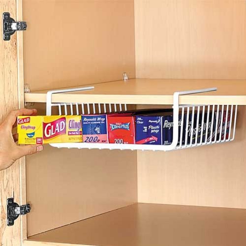 Made of heavy duty wire construction with a white vinyl coating that will not scratch wood shelving and easily wipes clean; wide support bars that rest on top of shelf to create a storage basket below. Shelf rack fits on solid shelves up to 1 1/4"" thick and at least 13 1/2"" deep and is ideal to use on standard 14"" kitchen cabinet shelving. The under shelf kitchen organizer helps maximize available storage space in kitchen drawers and cabinets. Imported.